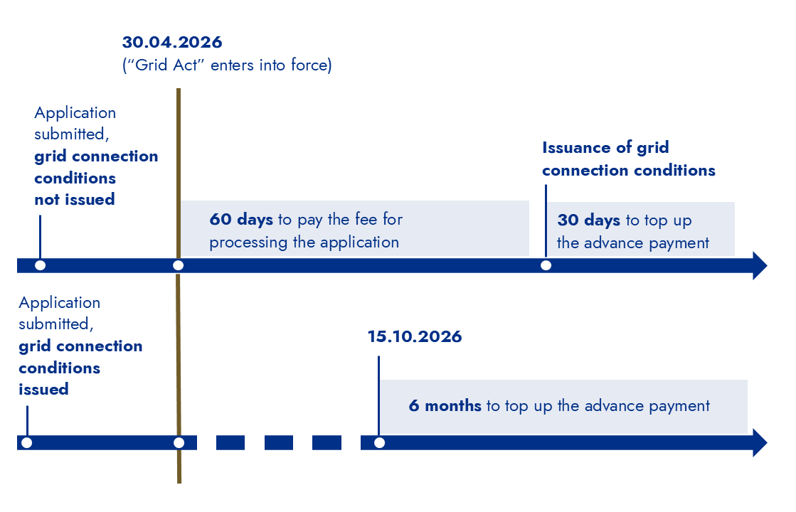 Investors who have secured grid connection conditions before 16 October 2026 but have not yet entered into a grid connection agreement, will be required to top up the advance payment for the grid connection fee by 15 April 2027. Failure to top up the advance payment will result in the grid connection conditions losing validity. It is worth noting that these regulations will enter into force later than most provisions of the amendment, namely on 16 October 2026 and not 30 April 2026. This may give rise to doubts in interpretation, especially if the grid connection conditions are issued, say, on 10 June 2026. Due to the ambiguous wording of the amending act, the deadline for topping up the advance payment may be either 10 July 2026 or 15 April 2027. For safety, we recommend taking a conservative approach.